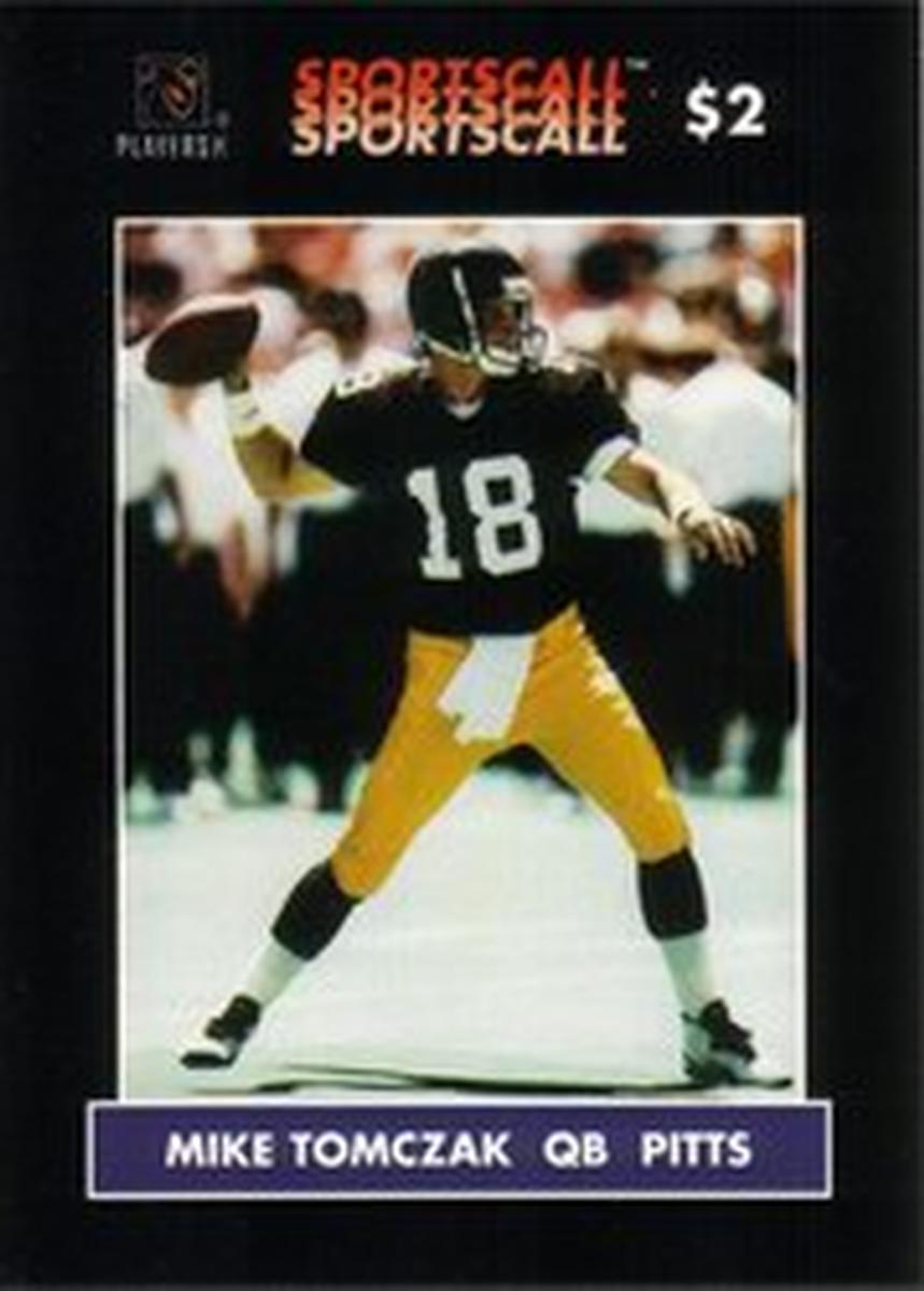 Overall, this collectible card highlights Mike Tomczak’s role as a professional NFL player for the Pittsburgh Steelers and is part of a SportsCall paper card series focused on football players. The card’s layout and imagery reflect official NFL branding and the player’s on-field identity.