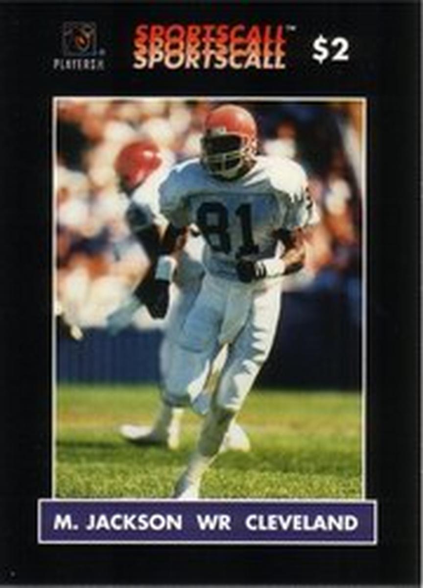 This collectible item is a SportsCall paper card featuring Michael Jackson, a wide receiver who played for the Cleveland Browns football team in the National Football League (NFL). The card prominently displays the NFL and Players Inc. logos, indicating its official licensing. The front side of the card shows a photographic image of Michael Jackson in his Cleveland Browns uniform, including the team colors and helmet design associated with the franchise.
