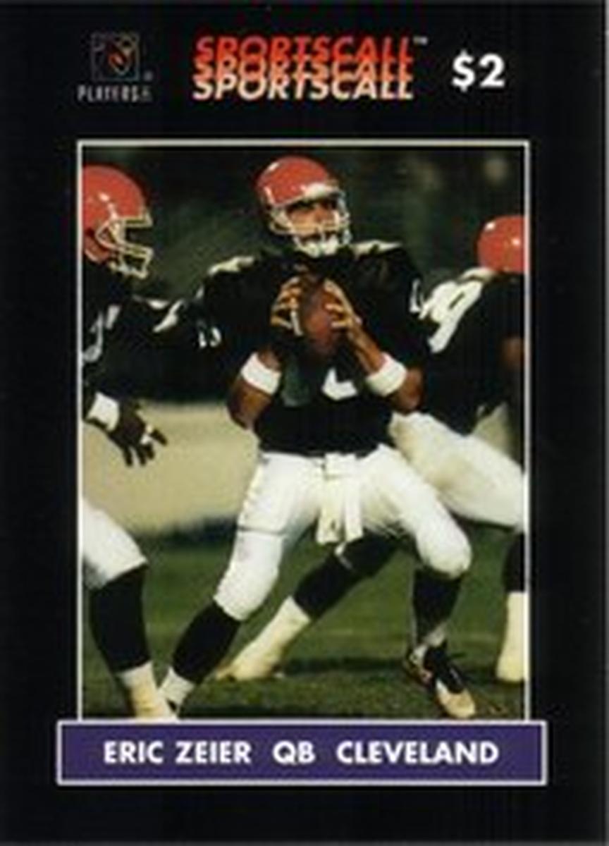The card highlights the Baltimore Ravens in text but focuses on Eric Zeier of the Cleveland Browns. The overall design reflects football themes, showcasing NFL branding consistent with official licensing. The card’s surface is smooth paper, characteristic of SportsCall collectibles, and includes the player's name and position clearly printed.