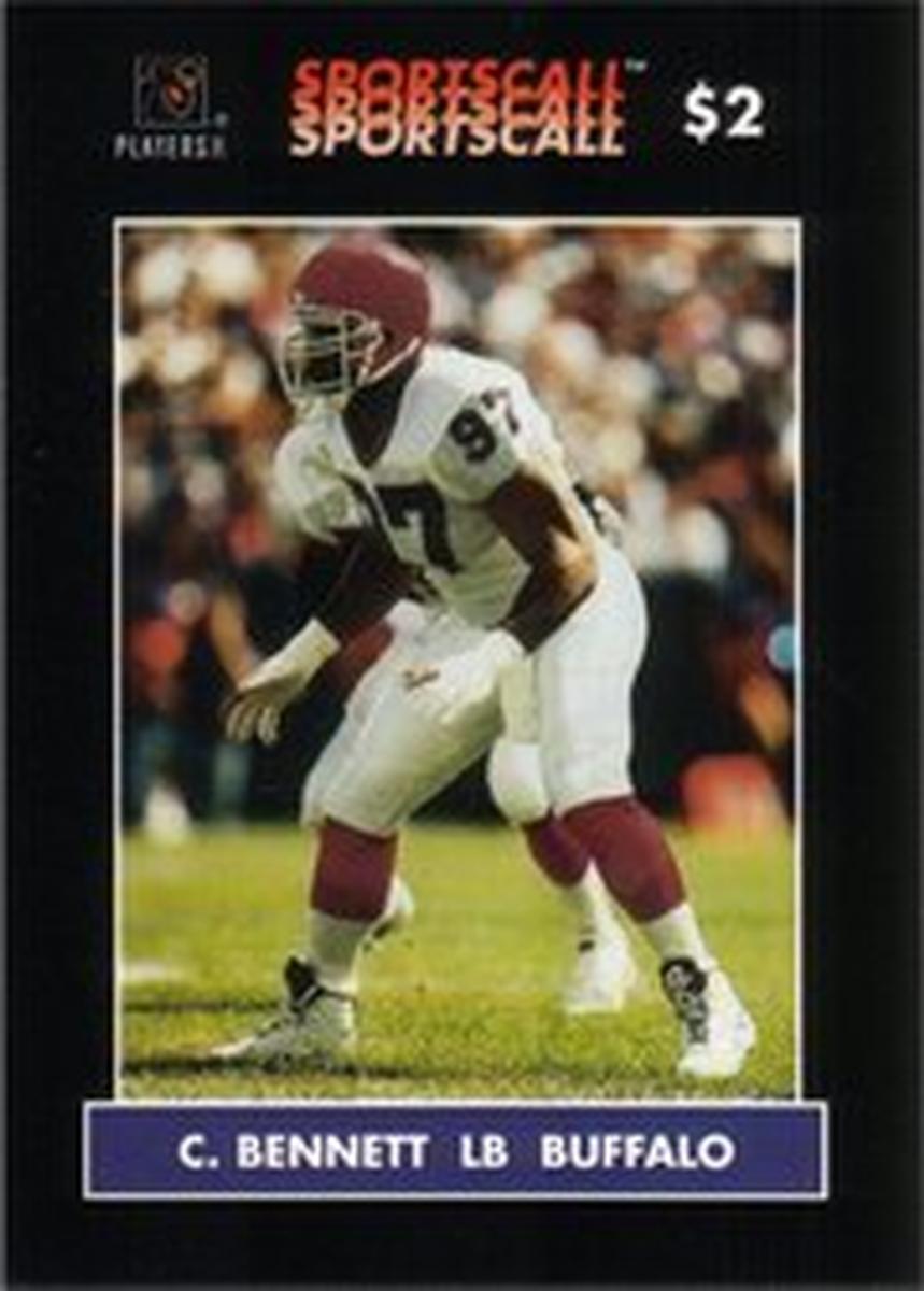 The card is numbered 362 and is issued by SportsCall, printed on paper material. It includes clear text indicating "Cornelius Bennett (LB Buffalo Bills Football)" and the SportsCall logo, tying it to sports memorabilia collectible cards. The overall design includes a small monetary denomination of $2 printed on the card, highlighting its collectible value.