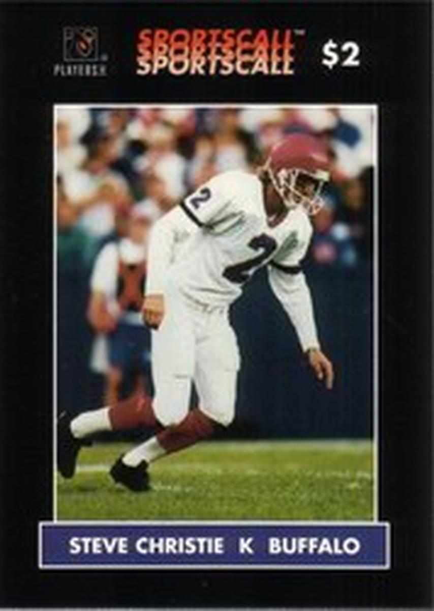 This card is printed on paper and includes text that identifies Steve Christie and his team. The combination of the SportsCall branding and the football content makes this a collectible item focused on the sport of football and specifically on the Buffalo Bills’ kicker.