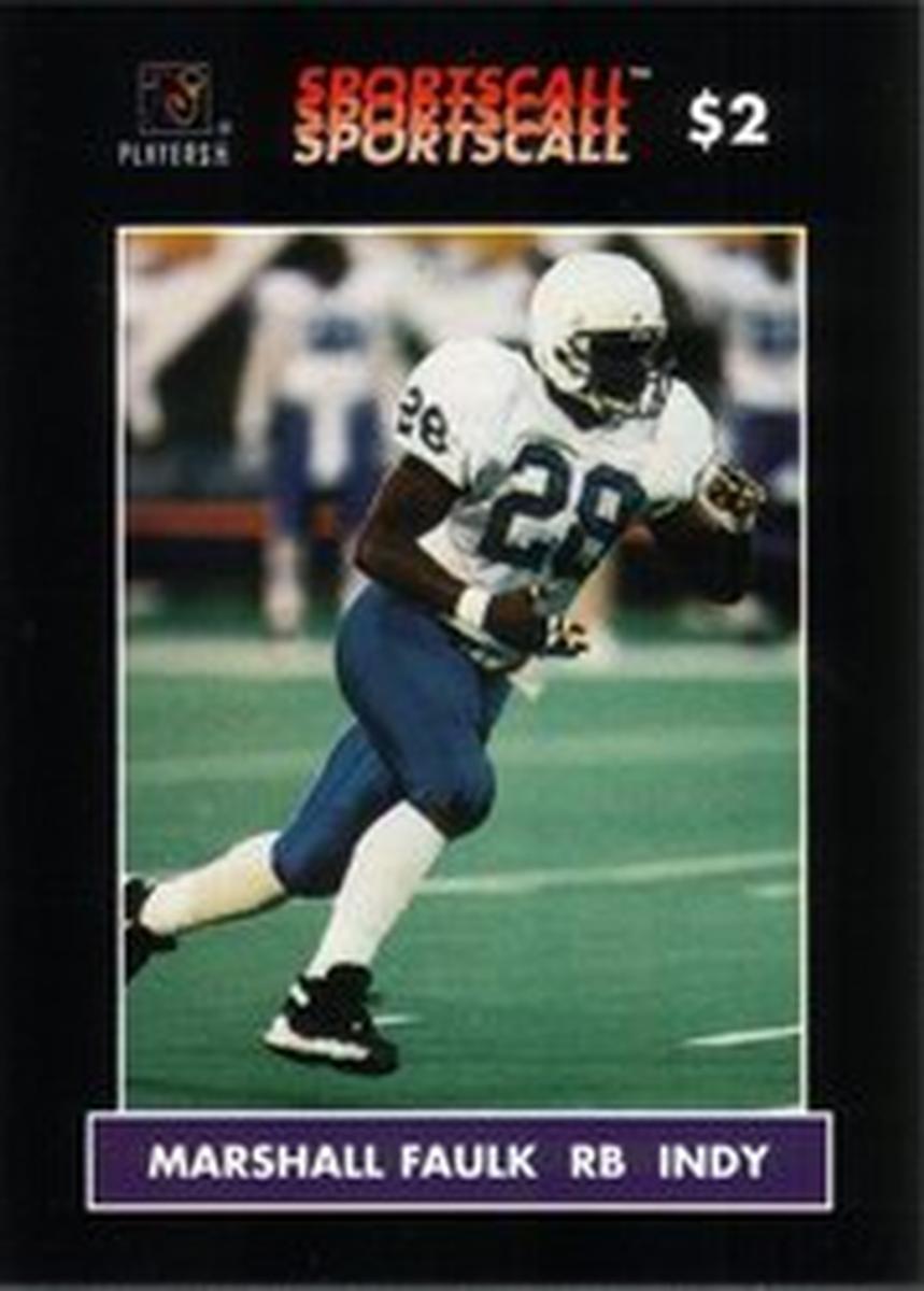 This collectible paper card features Marshall Faulk, a prominent running back for the Indianapolis Colts in the National Football League (NFL). The card is numbered 379 and issued by SportsCall. The design includes a color image of Marshall Faulk in his Colts uniform, showcasing him ready for action on a football field. The card highlights key elements related to NFL football, including the official NFL logo on the top left corner and the Indianapolis Colts team name clearly displayed.