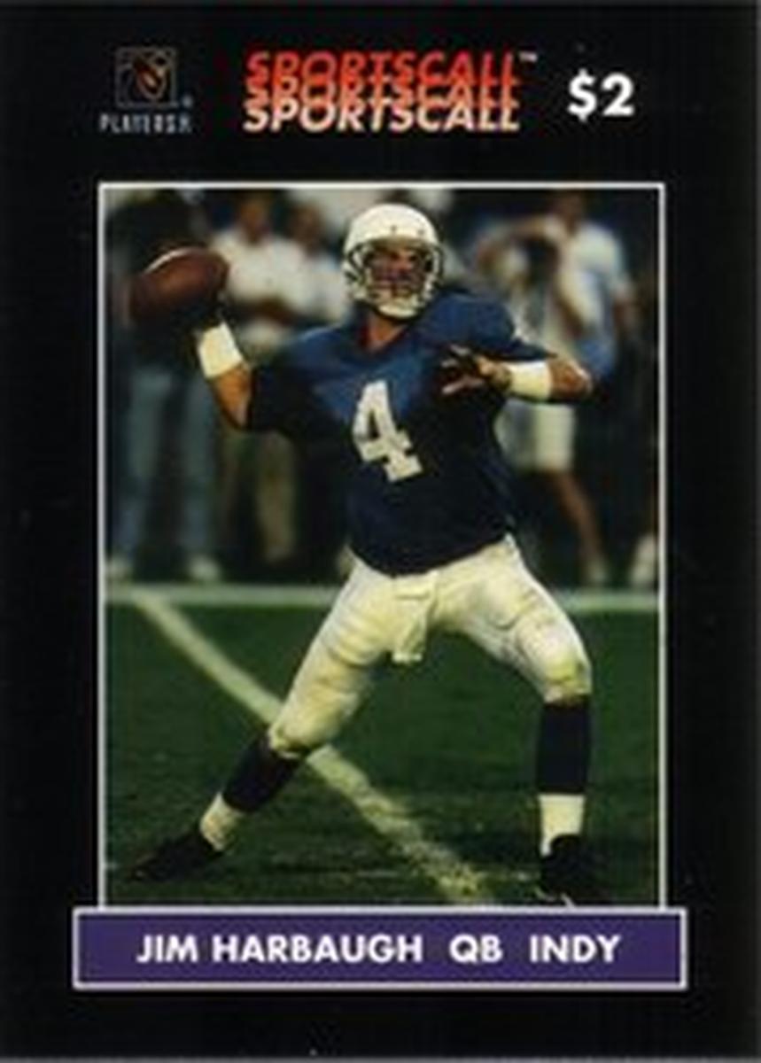 The card includes printed text with "Jim Harbaugh (QB Indianapolis Colts Football)" along with the card number #380. The SportsCall logo appears near the top of the card, and the $2 denomination is displayed in bold print. The card is made of paper and is designed as a collectible NFL phone card featuring the National Football League and associated branding.