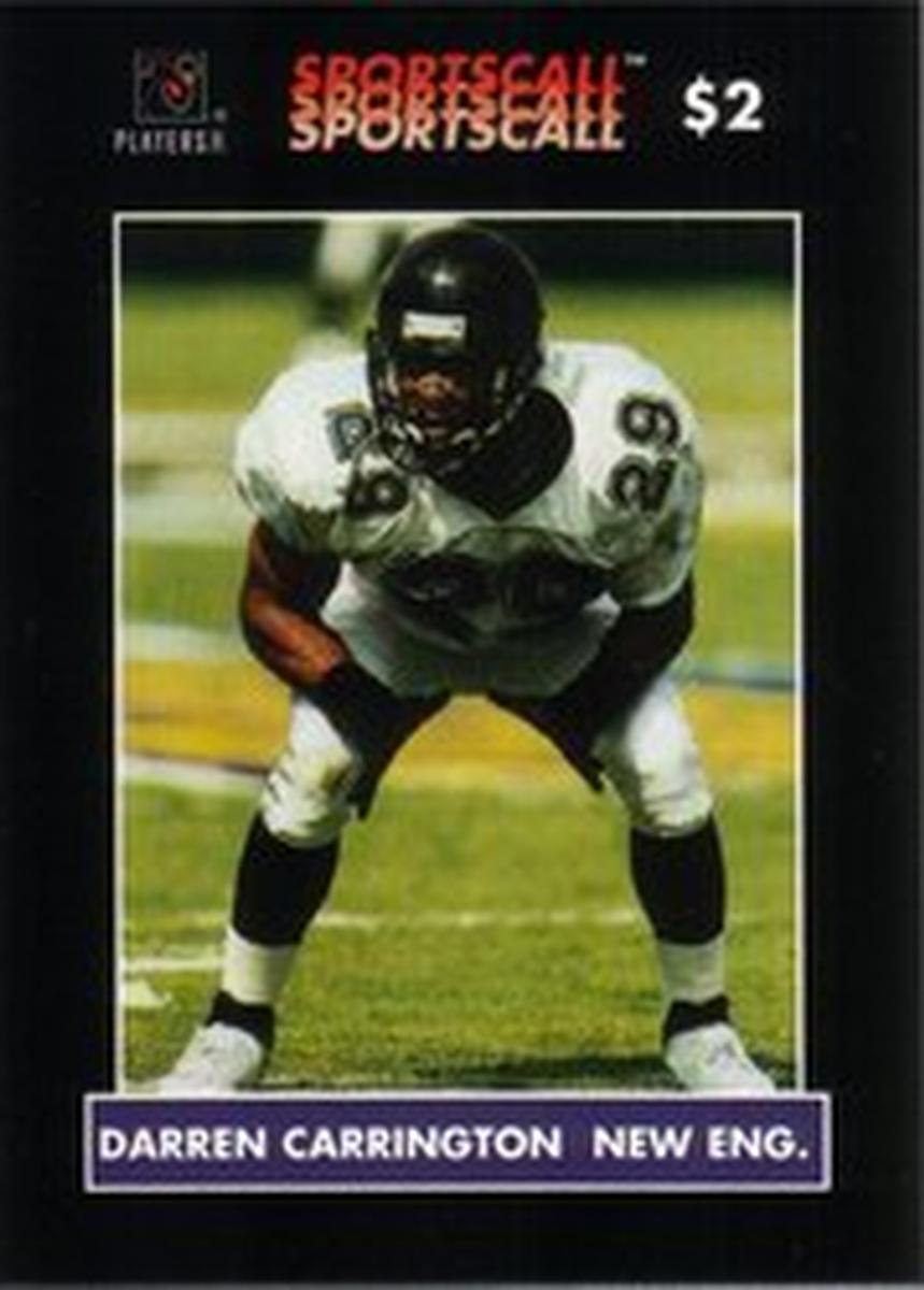 Text on the card confirms its status as a SportsCall phone card and mentions Jacksonville Jaguars as part of the keyword data but focuses on Darren Carrington representing the New England Patriots. The card’s elements confirm it is part of football collectible phone card memorabilia from the NFL, designed for collectors and fans of the sport and player.