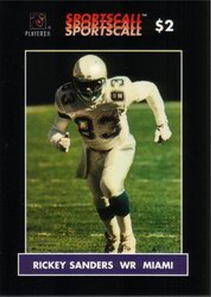 No additional branding or unrelated imagery appears on the front of the card besides those associated with the Miami Dolphins, Rickey Sanders, the NFL, and SportsCall. The focus remains solely on the football player and his connection to the Miami Dolphins franchise.