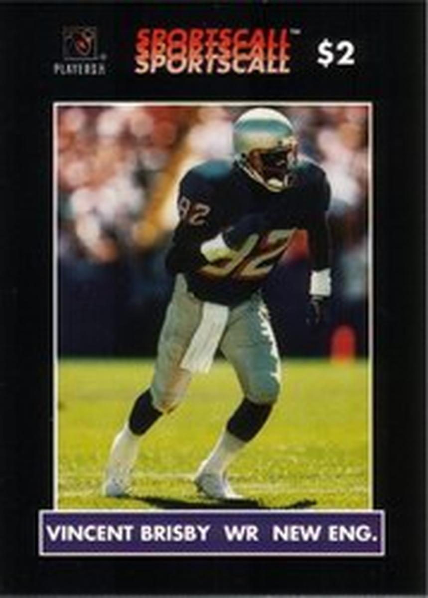 Overall, this is a football collectible card celebrating Vincent Brisby’s role as a wide receiver for the New England Patriots. The combination of player imagery, NFL logos, and official licensing marks makes this item a valuable piece for fans of American football and card collectors.