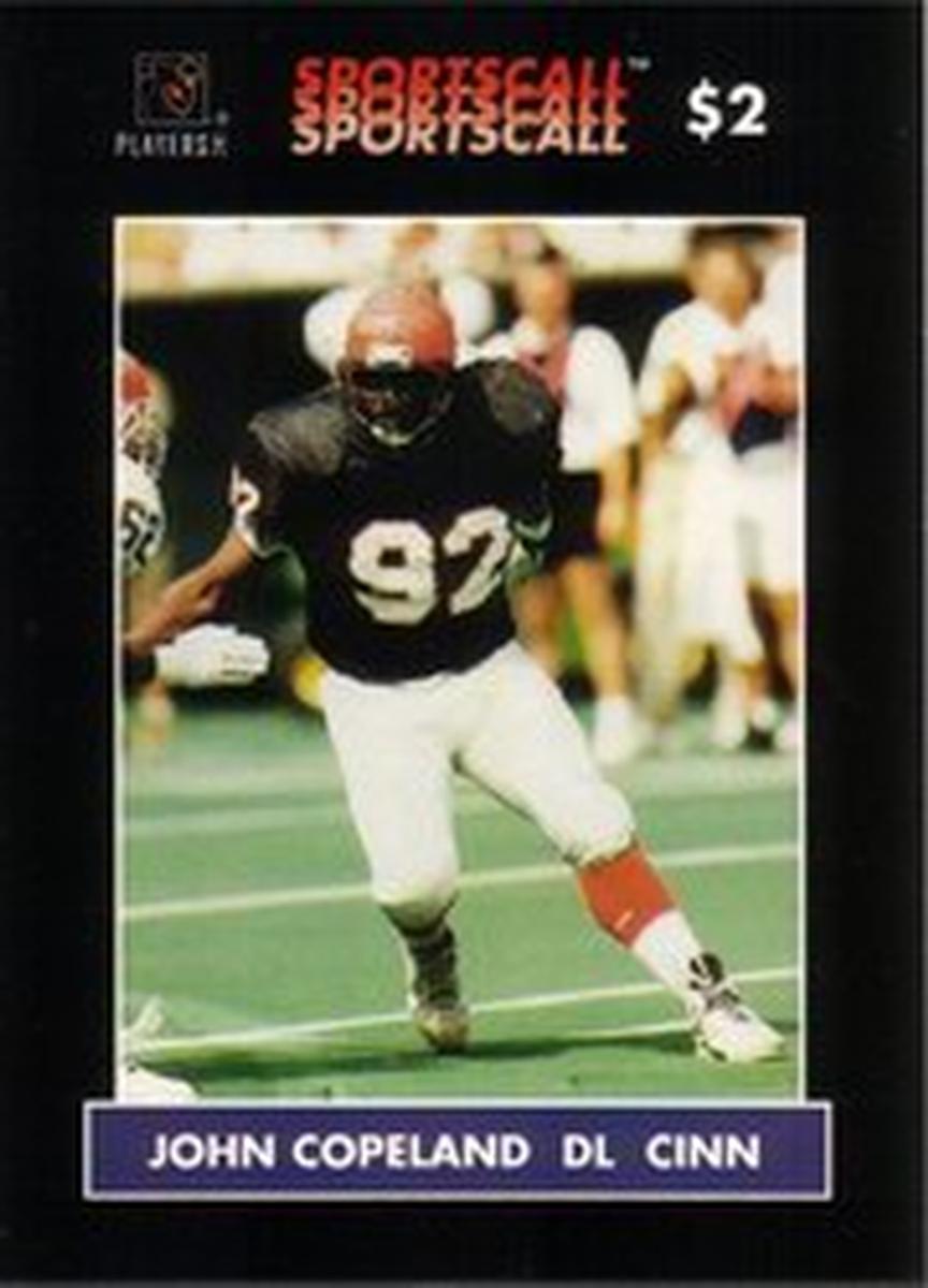 This collectible card features John Copeland, a defensive lineman for the Cincinnati Bengals football team. The card displays a large, clear image of Copeland wearing his black Bengals uniform with orange and white accents, including the team’s distinctive tiger-striped helmet. The image captures Copeland on the field in a dynamic football stance during a game, emphasizing his athletic presence.