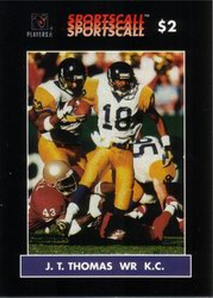 The text on the card includes the denomination "$2" and references the sport "Football." The design is clean and structured, with the football helmet serving as the main visual element against a white background. This card is issued by SportsCall and is designated as a paper collectible. The card’s style and graphical elements emphasize its connection to professional NFL football, particularly the St. Louis Rams team identity.