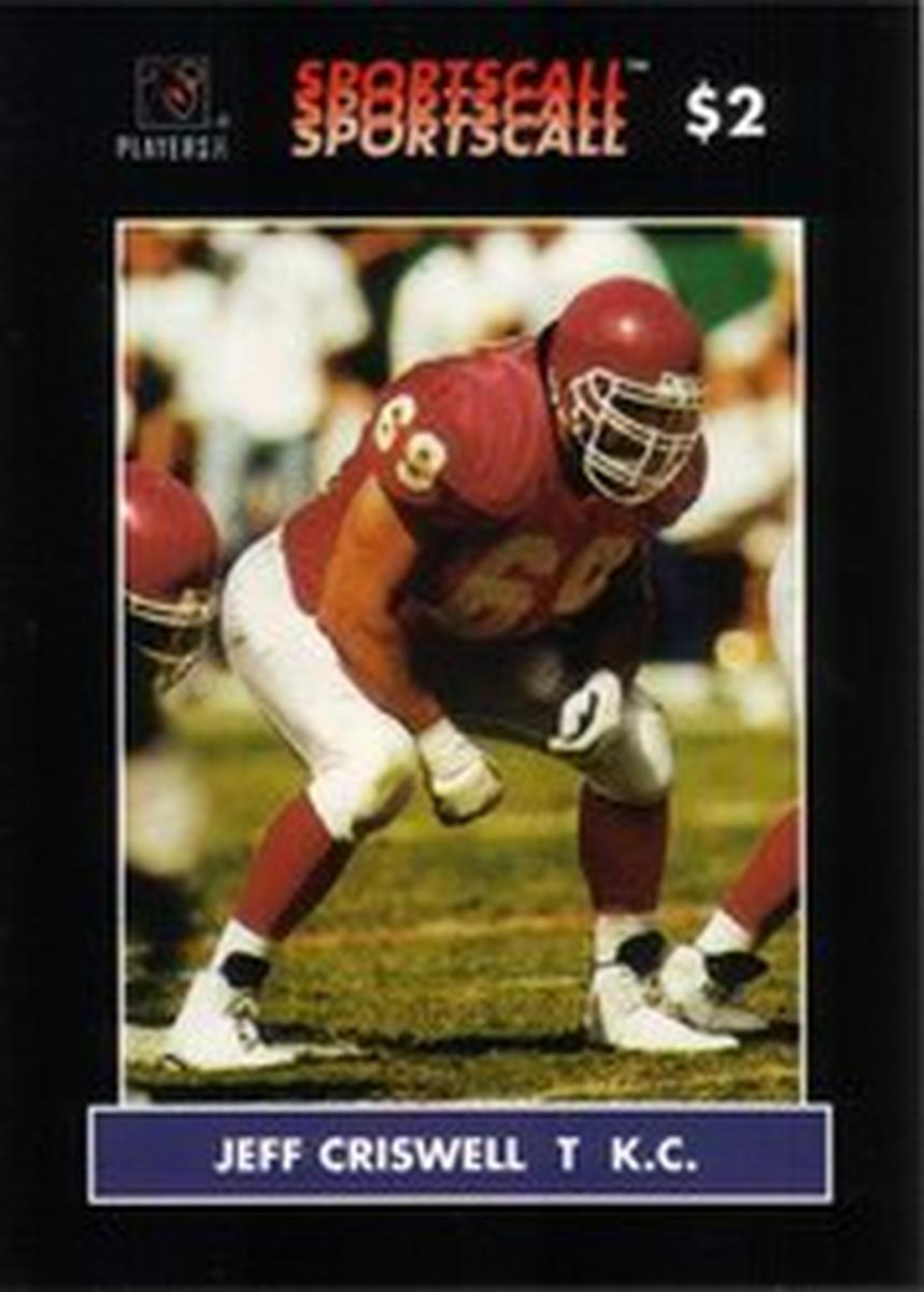 The visual presentation includes imagery consistent with football, specifically referencing the NFL and featuring branding related to the league and its players. The card emphasizes Jeff Criswell’s role as a football player with the Kansas City Chiefs, showcasing his name and team details clearly on the front. This card serves as a sports collectible focused on NFL football and athletes.