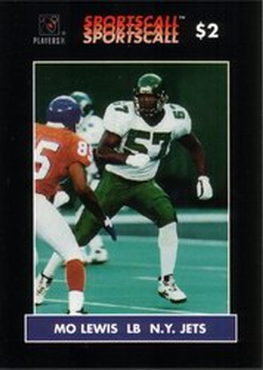 This collectible card features Mo Lewis, a linebacker for the New York Jets football team. The card is issued by SportsCall and is numbered 398. The denomination printed on the card is $2. The front displays the NFL (National Football League) and Players Inc. logos, confirming its official association with the league and its players. Mo Lewis is pictured in his New York Jets uniform, standing in a posed action stance.