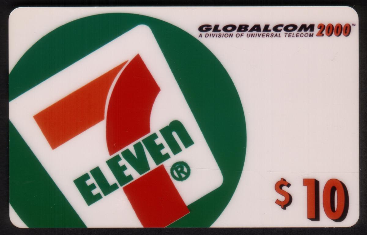 This phone card is a collectible item featuring official corporate branding associated with 7-Eleven and Globalcom. It serves both as a functional phone card and a collectible featuring a well-known corporate trademark from the turn of the millennium.