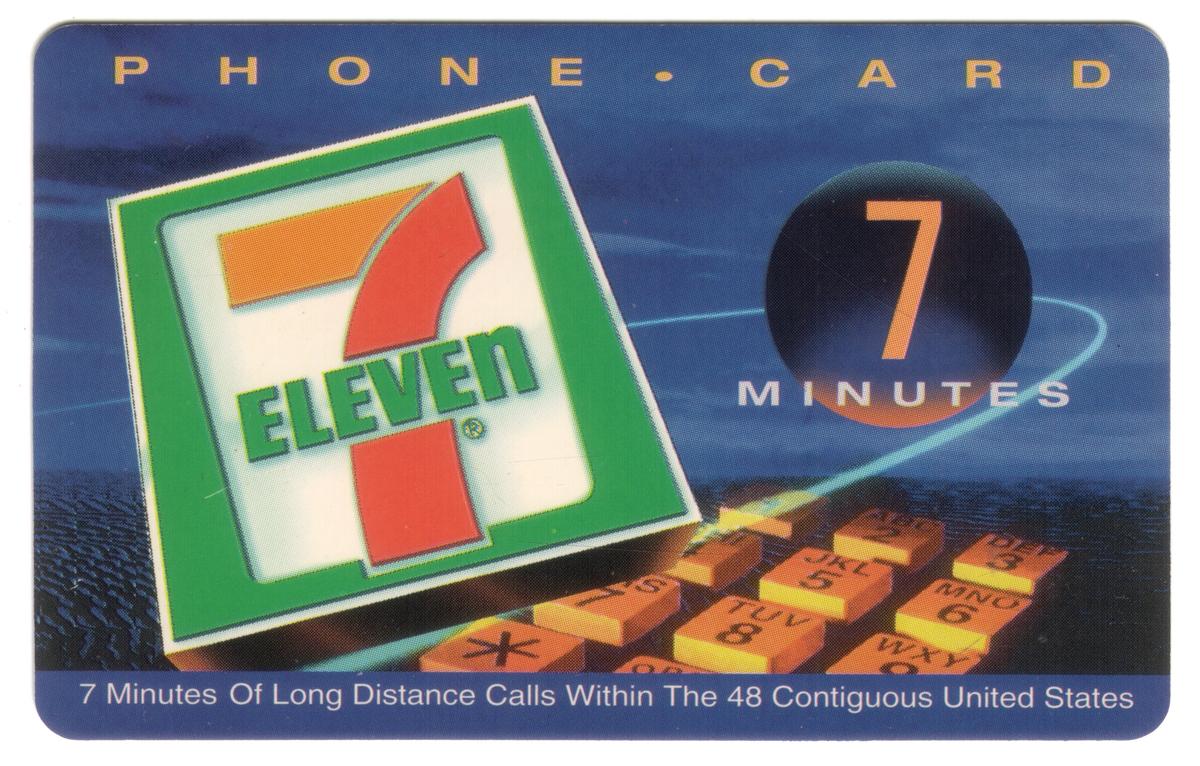 This collectible phone card features the prominent colorful 7-Eleven logo displayed in a tilted square frame on the left side of the card. To the right, a glowing "7" appears inside a dark sphere with the word "MINUTES" beneath it, indicating the card's value for seven minutes of call time. The background showcases a close-up image of an orange telephone keypad with black numbers and letters, subtly highlighted with a blue glow and faint oval rings, creating a modern, tech-inspired feel.