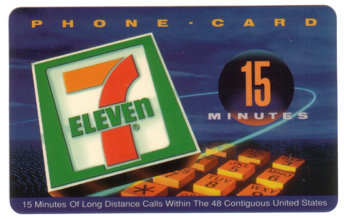 This phone card is laminated and issued by VarTec Telecom, with the Southland Corp. affiliation noted through the 7-Eleven branding. The design highlights the card’s function as a prepaid phone card usable for long-distance calls across the continental U.S.
