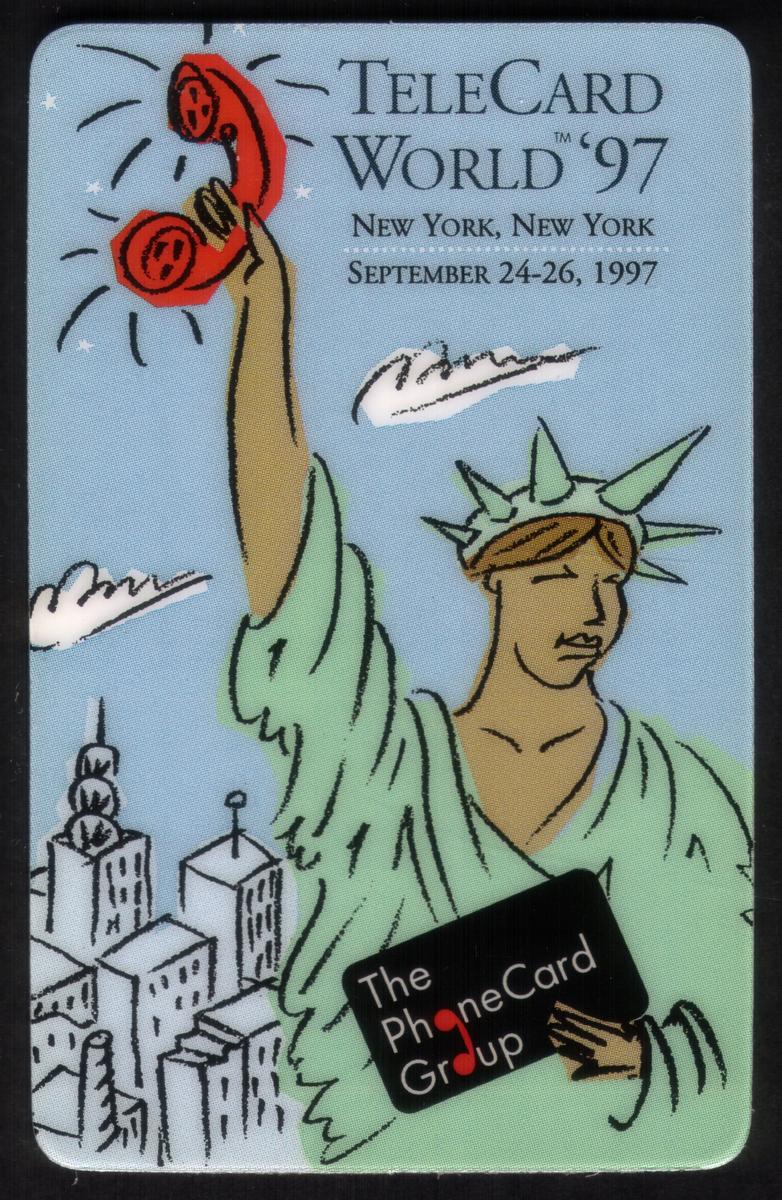 Additional textual elements include "The Phone Card Group" and the WorldCom logo, representing organizations involved in the telecard industry at the time. The design blends corporate branding with a cityscape, making it a memorable collectible for those interested in telecommunications and New York City memorabilia from the late 1990s.