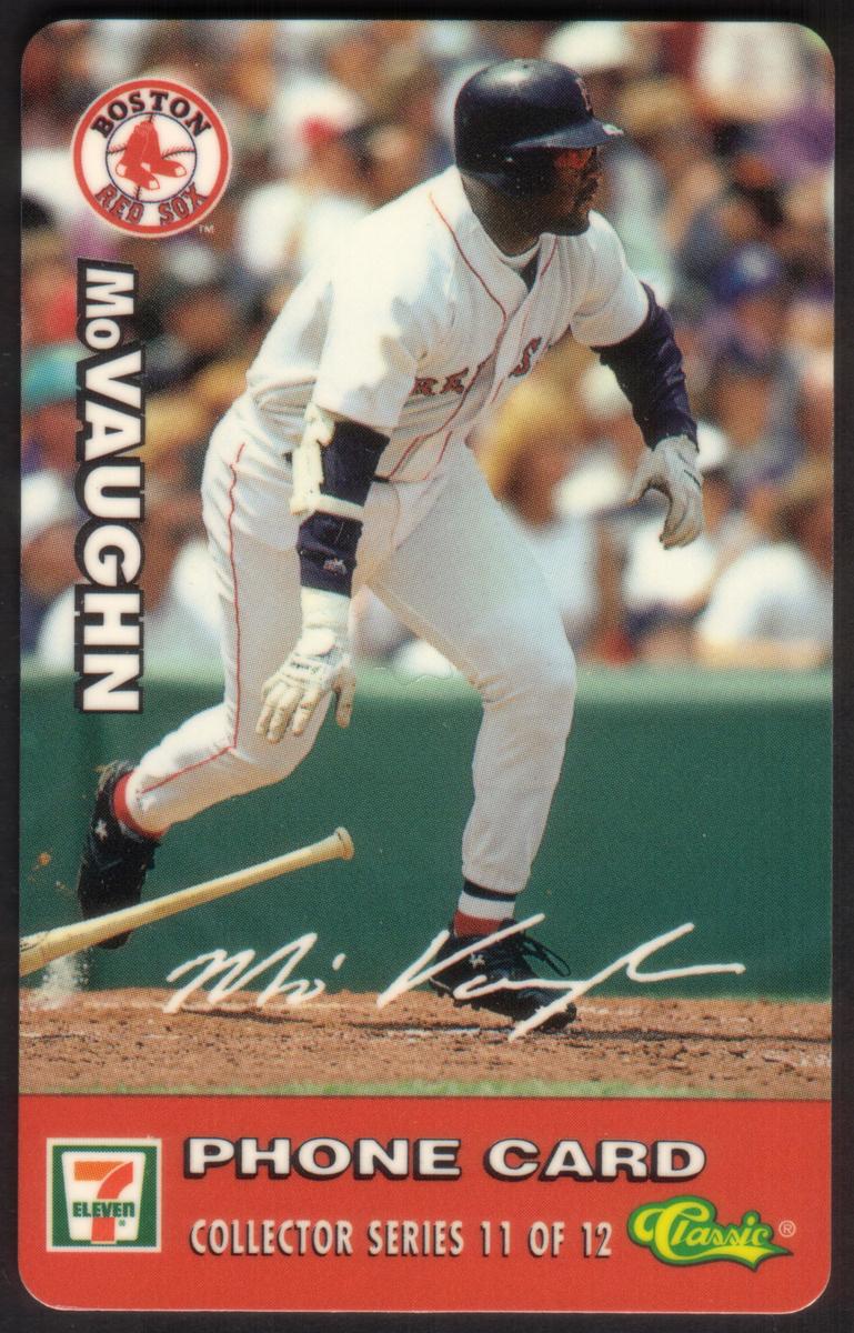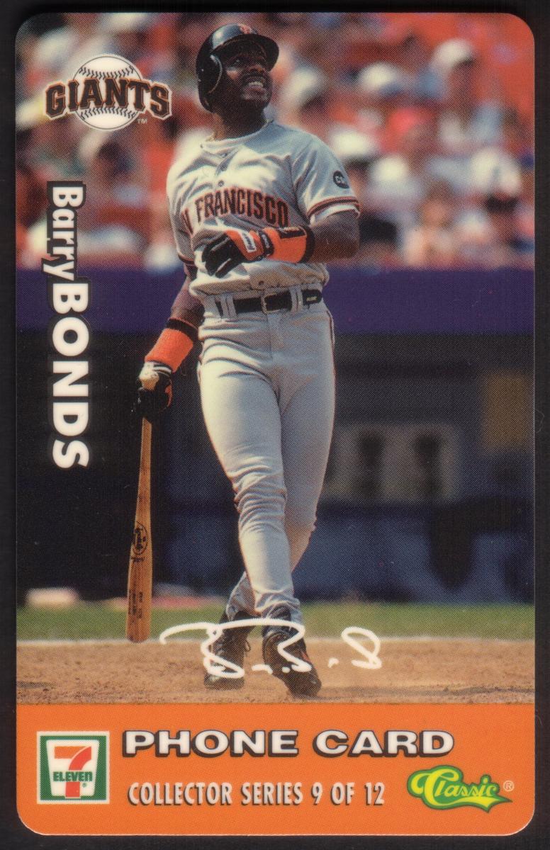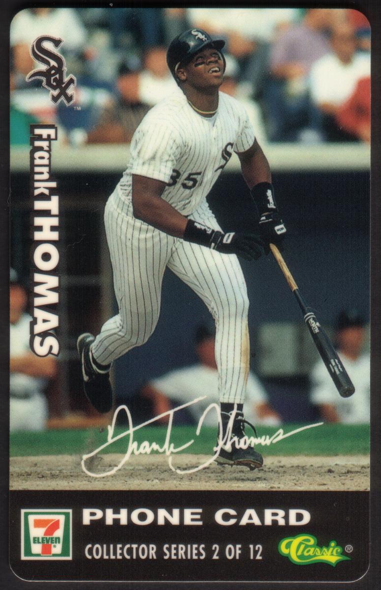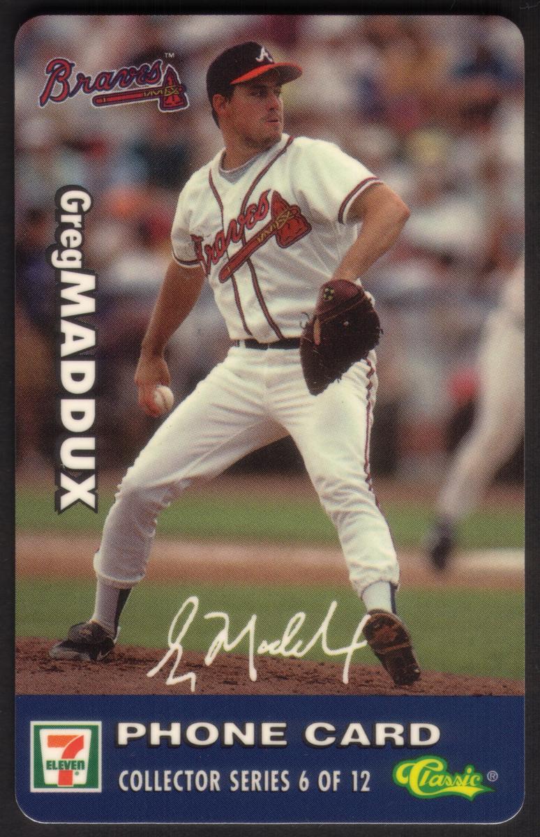 This set of twelve collectible phone cards from 7-Eleven features prominent Major League Baseball players from 1996, each card marked as part of the "Classic" Collector Series 1 of 12 through 12 of 12. Each card includes the 7-Eleven logo at the bottom alongside the words "PHONE CARD" and the player's facsimile autograph in white near the bottom center of the card. The cards showcase action shots of players in uniform during gameplay.