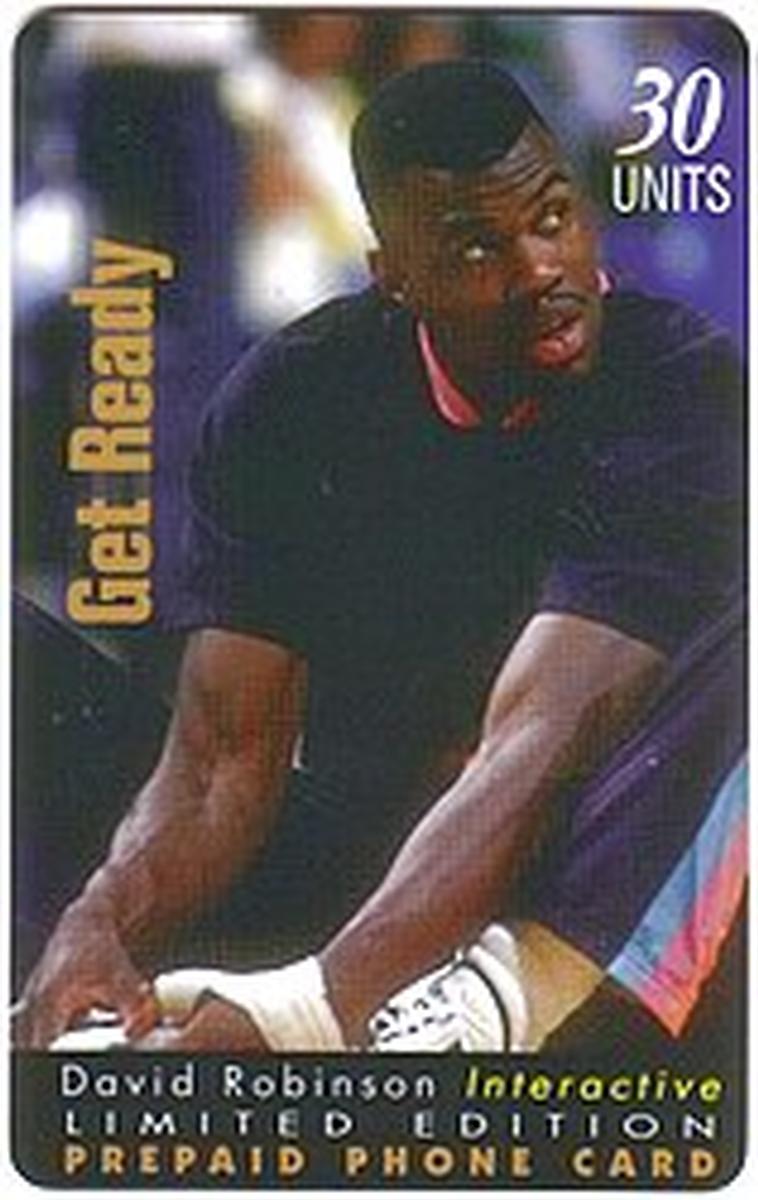 The design integrates a combination of photographic and graphic elements, with David Robinson’s image front and center, complemented by a bold blue and black color scheme. The lower portion of the card features the phrase "Get Ready," aligning with the dynamic portrayal of the athlete. This card belongs to a basketball-themed collectible series and celebrates a notable figure in NBA history.