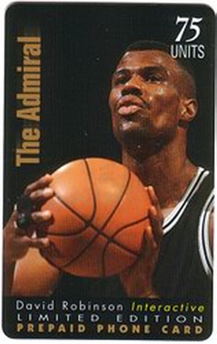 The design emphasizes David Robinson’s nickname, "The Admiral," along with his association with the NBA All-Star 75U, indicating a commemorative or special edition related to his career. The card includes logos and trademarks related to the NBA and the GE Exchange, signifying official licensing and collectible status. The overall presentation celebrates David Robinson’s contributions and legacy in professional basketball.