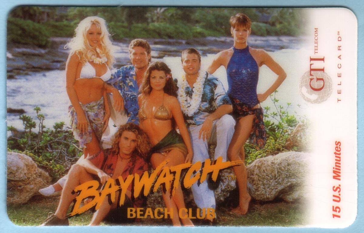 The card includes the text "15m Baywatch TV Show Beach Club" indicating a 15-minute calling time denomination. The card is issued by GTI Telecom, Inc., as indicated by the logo and company name printed on the card. The overall design connects directly to the entertainment and television show categories, highlighting the famous popular culture icon Baywatch.