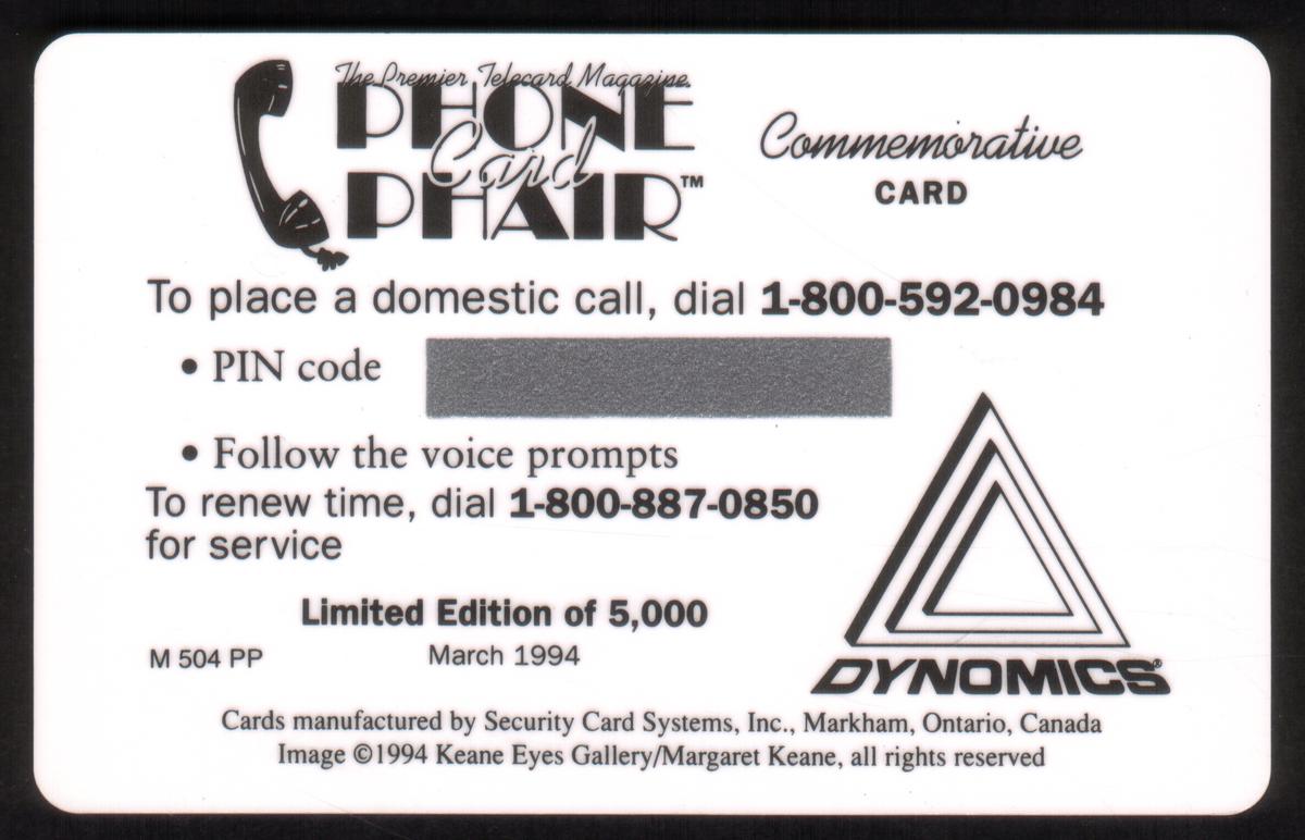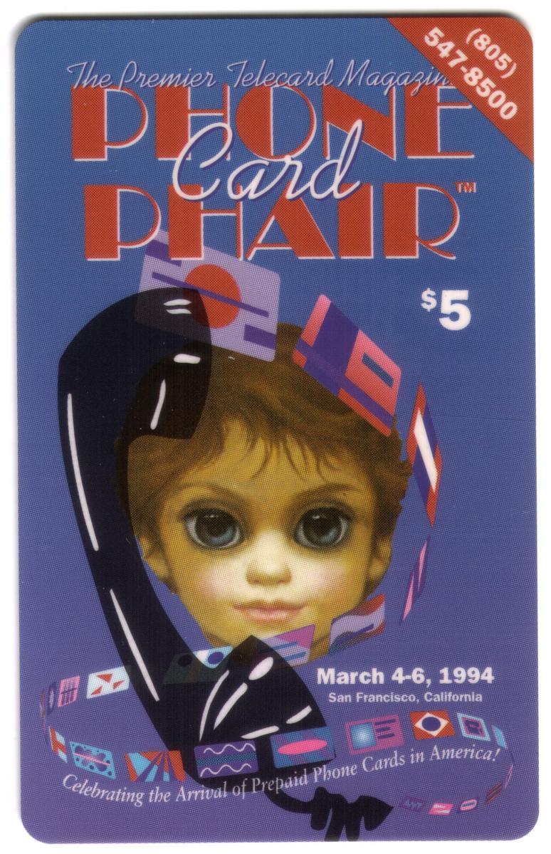 At the bottom of the card, the date and location of the event, “March 4-6, 1994 San Francisco, California,” are printed in white. Below that, a celebratory message reads, “Celebrating the Arrival of Prepaid Phone Cards in America!” This card connects Margaret Keane’s iconic art with the expanding telecommunication culture of the early 1990s, capturing a specific historical moment in the collectible phone card industry.