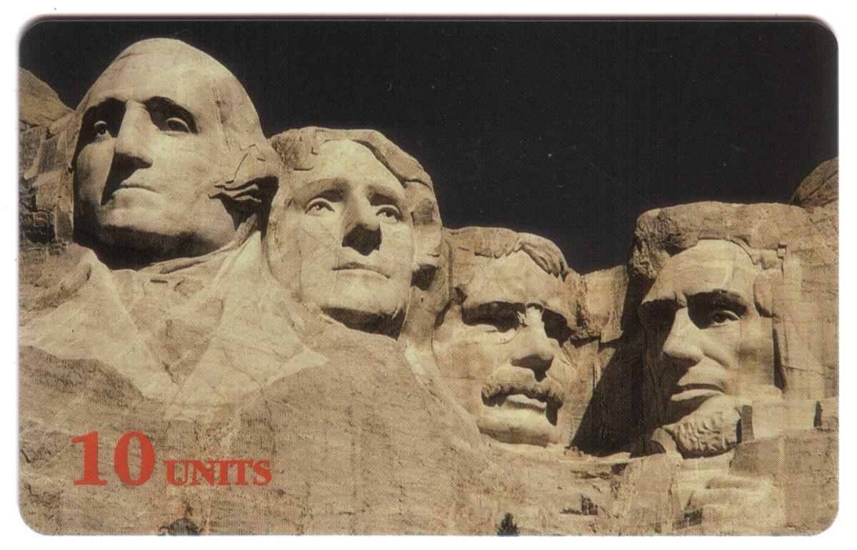 This phone card is part of a series highlighting national monuments and historical sights, making it a collectible item for those interested in American history and landmarks. The use of the Mount Rushmore image underlines its importance as a national memorial and a prominent symbol of the United States.
