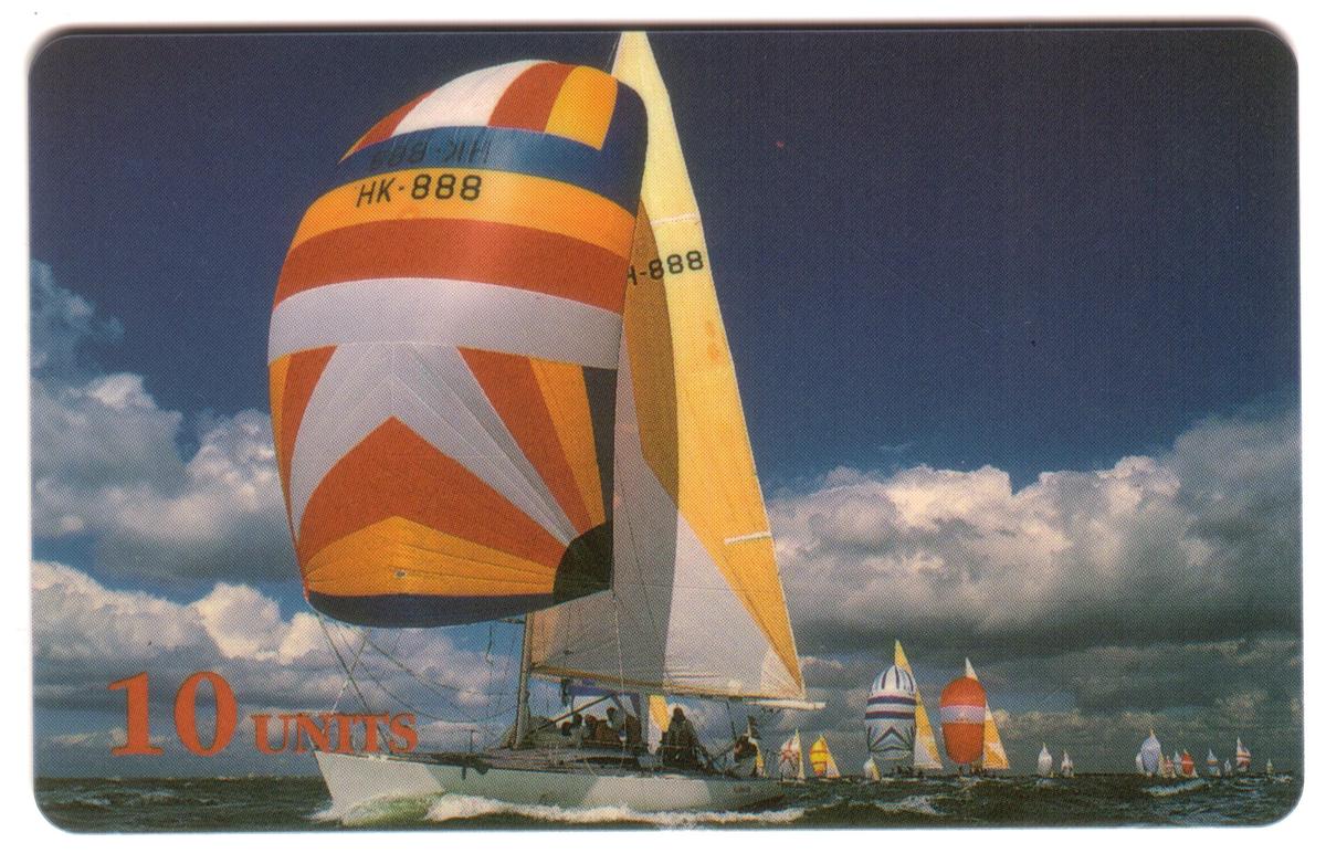 The collectible phone card features a vibrant image of a sailboat race on open water under a partly cloudy sky. The central sailboat has an orange, white, and blue spinnaker sail prominently displaying the identifier "HK-888." The main sail is yellow, adding to the vivid color scheme of the scene. Numerous other sailboats with colorful sails are visible in the background, creating a picturesque view of competitive sailing.