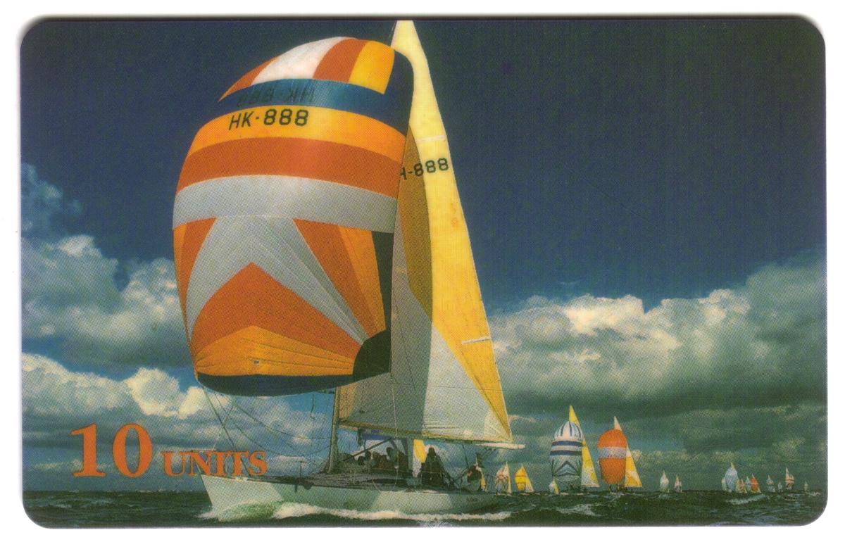 This collectible card features a vibrant color photograph of a sailboat race under partly cloudy skies. The main sailboat in the foreground has a large, striking spinnaker sail with orange, white, and blue geometric patterns, marked with the identification "HK-888." The boat's mainsail is mostly pale yellow. Several other sailboats with colorful spinnakers and sails are visible in the background, stretching across the water, showcasing a lively nautical scene.
