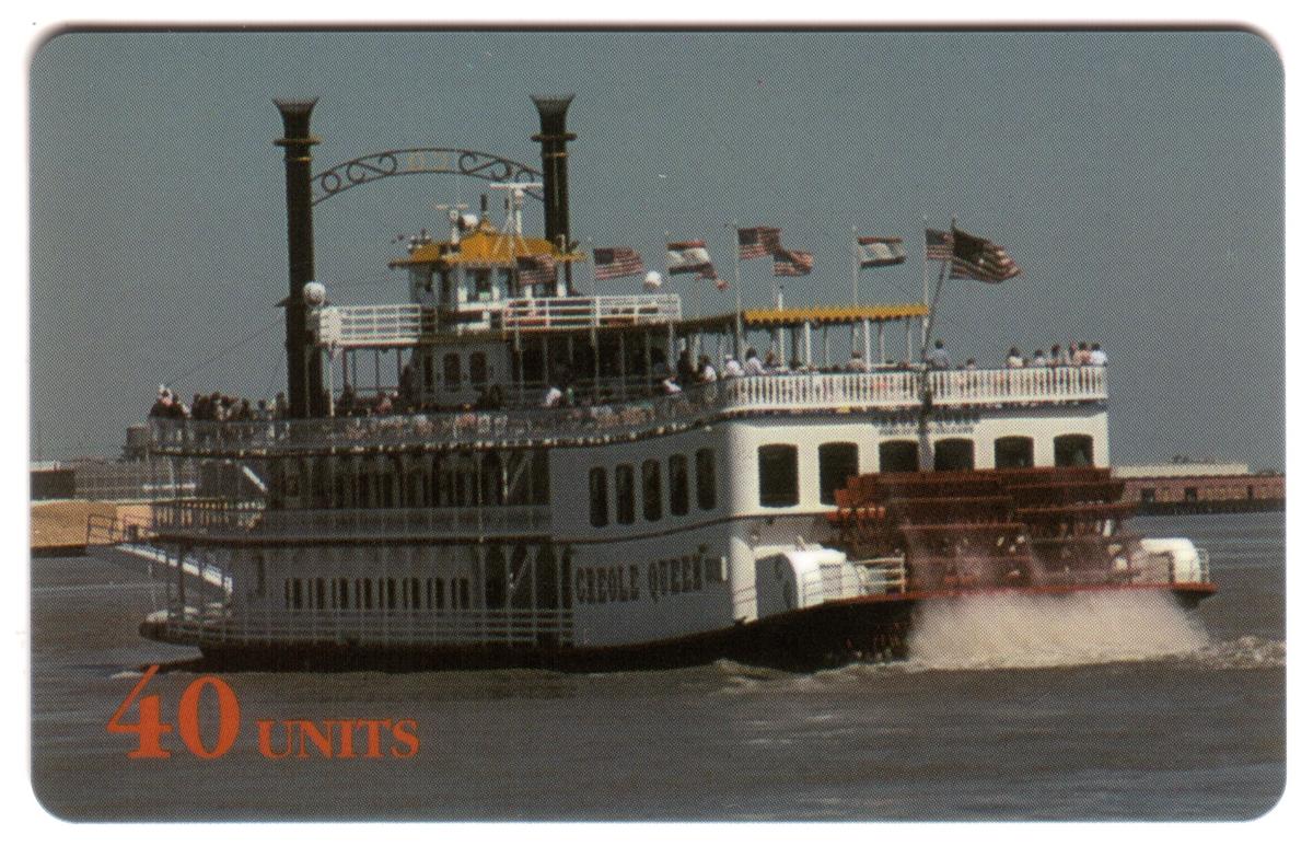 This collectible phone card features a detailed color photograph of the paddle wheel boat named "George Queen." The boat is shown in motion on the water, with the paddle wheel actively churning and creating a wake behind it. The vessel's structure includes multiple decks, with railings and numerous passengers visible on the top deck. The boat displays several flags flying on poles along the upper deck, including the American flag.