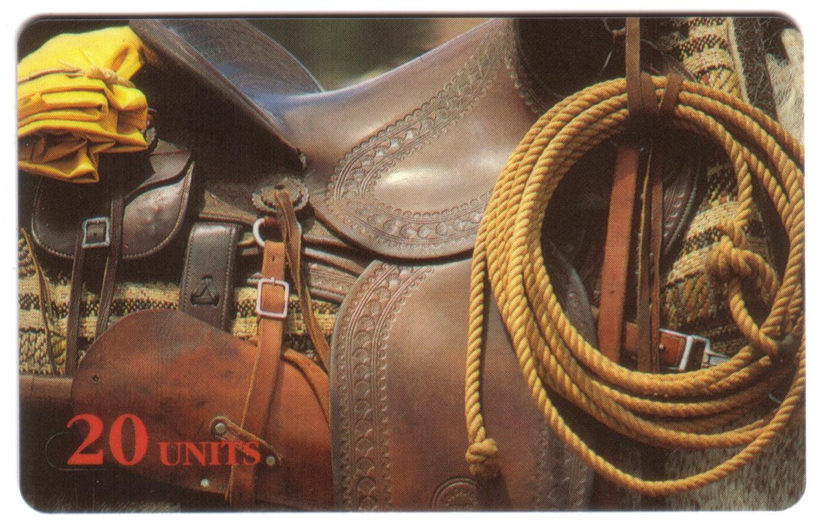 Red text in the lower left corner indicates “20 UNITS,” signifying the card’s value. The overall image captures the essence of the western cowboy lifestyle through its detailed portrayal of essential riding and roping gear.