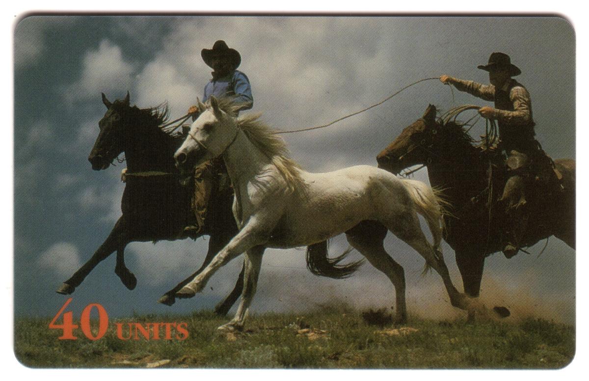 This collectible phone card features a vivid image of two cowboys on horseback actively roping a wild white horse running between them. The cowboy on the left rides a dark horse and wears a black cowboy hat and blue shirt, while the cowboy on the right, also on a dark horse, wears a brown patterned shirt and a black cowboy hat. Both cowboys are holding ropes aimed at capturing the wild horse, which is shown galloping with its mane flowing, conveying dynamic motion.