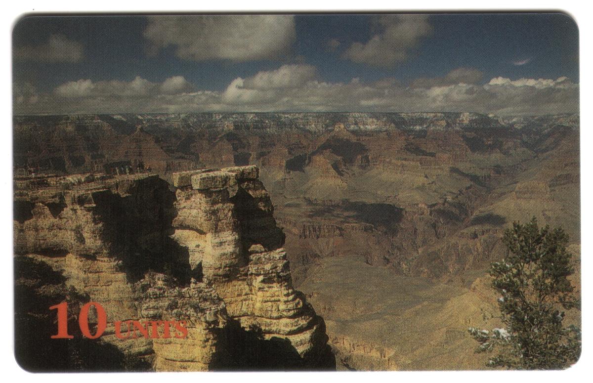 This collectible phone card features a scenic view of the Grand Canyon located in the Western United States. The image displays vast rock formations and rugged canyon walls under a partly cloudy sky. The foreground includes a prominent layered rock cliff with textured surfaces and shadows that highlight the depth and scale of the canyon.