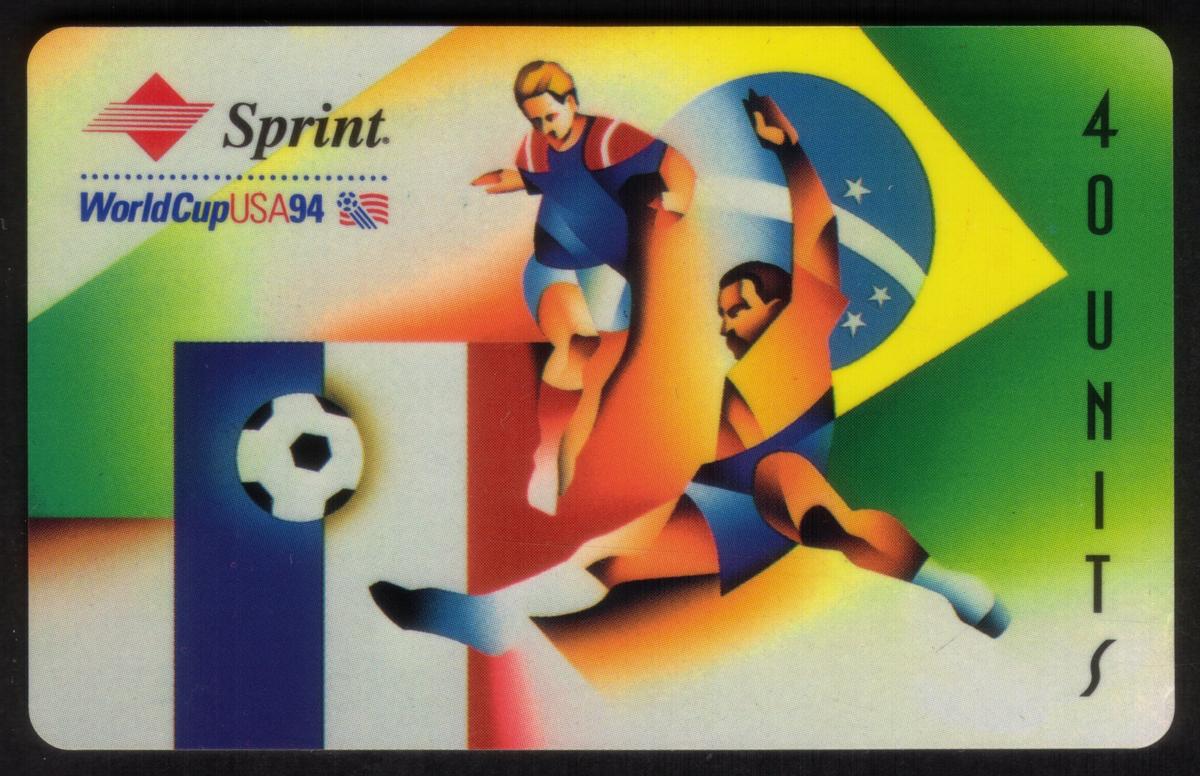 The card is labeled with the title "40u World Cup Soccer 1994 - Brazil & France - 1st Ed. (Upright '94) - Sprint," clearly associating it with the Sprint brand, a sponsor connected to the World Cup event. The layout is upright and uses bold, sharp colors, including green, yellow, and blue, which are prominent in Brazilian imagery, and blue, white, and red, representative of France’s colors.