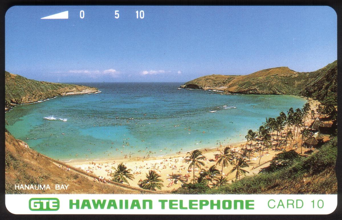 This collectible phone card features a vibrant image of Hanauma Bay in Hawaii, showcasing a picturesque coastline with clear turquoise waters and a sandy beach filled with people. The bay is framed by green hills and rocky outcrops under a bright blue sky with a few scattered clouds. Along the shoreline, a row of tall palm trees stretches across the beach, enhancing the tropical scenery.