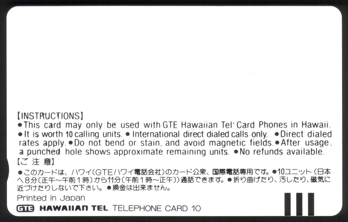 At the bottom left corner of the card, the text "HANAUMA BAY" appears in white capital letters. Below the image, the card displays "GTE HAWAIIAN TELEPHONE" in green letters, with "GTE" on the left side in a bold green font and "HAWAIIAN TELEPHONE" next to it in slightly larger green font. On the far right side at the bottom, "CARD 10" is printed in green.