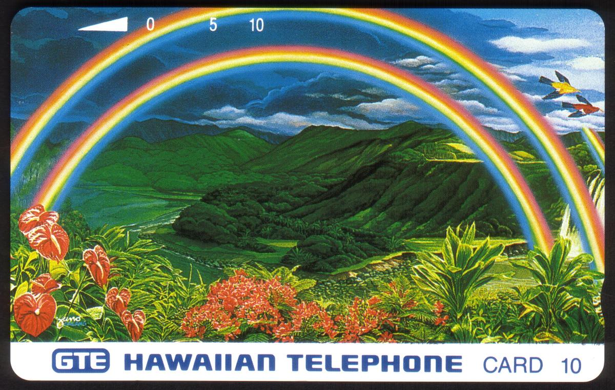 Vibrant Hawaiian scene with lush valleys, rainbows, tropical flora, and flying birds, featuring GTE Hawaiian Telephone branding and security features. |