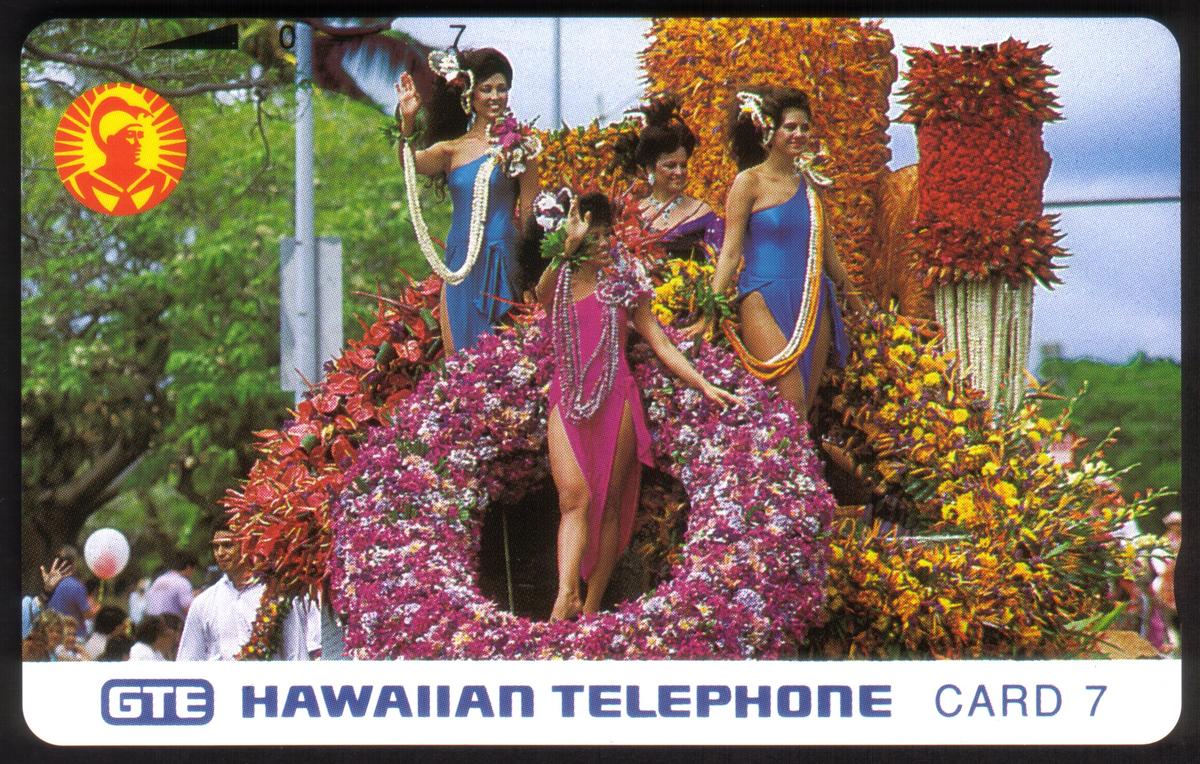 This card is a unique collectible related to the Hawaiian culture, travel, and the Aloha Festival, reflecting the spirit and beauty of Hawaii through its floral craftsmanship and festive atmosphere during the 1991 parade event.