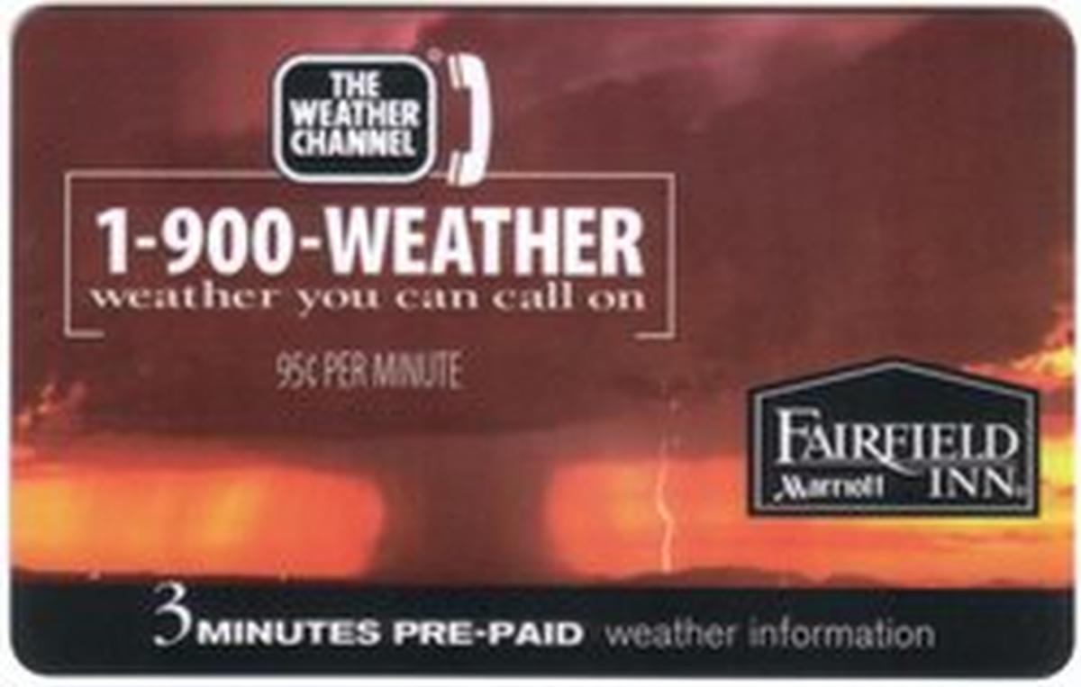 Prominently displayed in the design are logos and trademarks connected to The Weather Channel and AT&T MultiQuest Services. The Weather Channel's branding includes the phone number 1-900-WEATHER, reinforcing its association with weather updates and forecasts. Additional logos include those for AT&T and 3M Weather Service, linking the card to telecommunications and meteorological services. The card also references Fairfield Inn Marriott, suggesting a promotional collaboration involving this hotel chain.