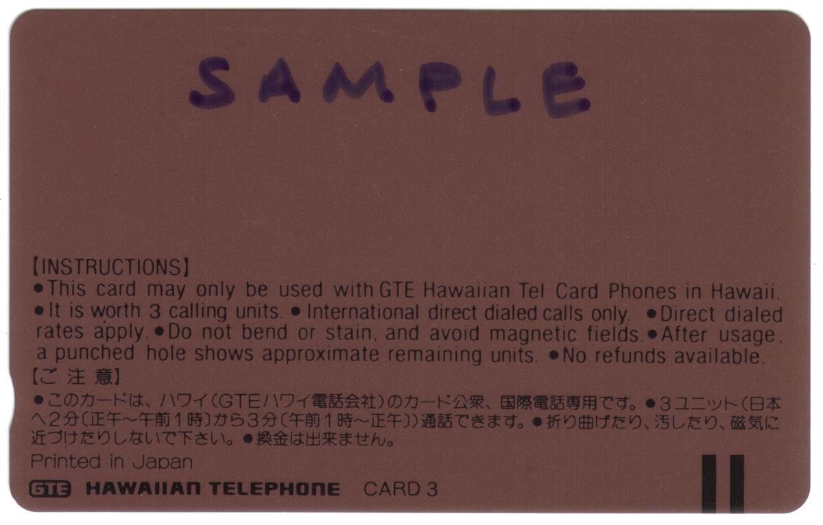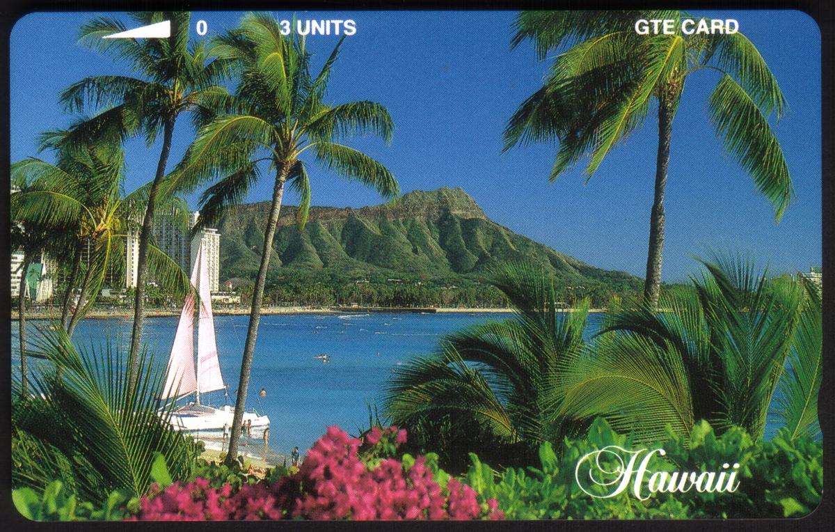 Hawaii scene with Diamond Head, palm trees, sailboat, and tropical flowers on a phone card featuring 3 units, GTE branding, and functional design. |