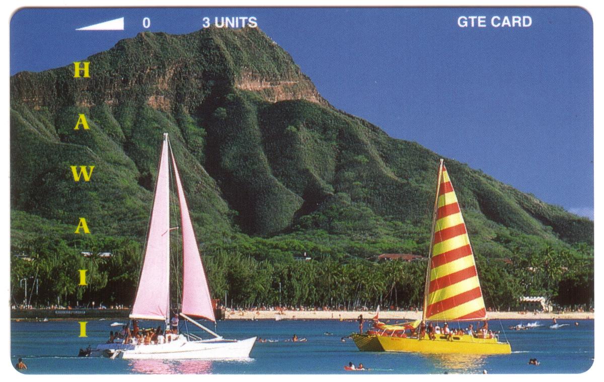 This card was issued by GTE Hawaiian Telephone and highlights sailing and boating as recreational activities in Hawaii, set against the iconic backdrop of Diamond Head’s volcanic mountain terrain and tropical beaches. The overall design captures Hawaii’s natural beauty and outdoor leisure culture.