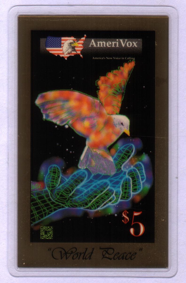 The card is associated with AmeriVox, indicated by the logo at the top left, which consists of an American flag shaped into the United States map alongside a bald eagle's head. AmeriVox's tagline, "America's New Voice in Calling," appears beneath the logo. The value of the card is marked as $5 in red at the bottom right corner.