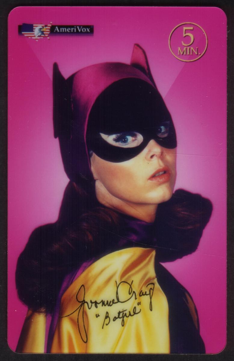 Produced by AmeriVox, the card highlights Batgirl with clear references to the superhero genre, incorporating elements of art and entertainment related to television and movies. It is suitable for collectors interested in superhero memorabilia, especially those focused on classic TV show characters and their actors.