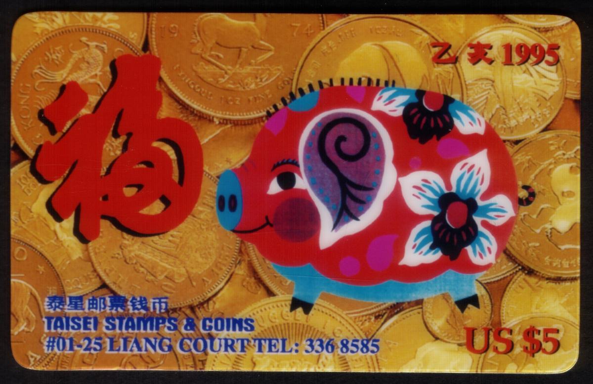 Overall, this phone card serves as a cultural tribute that merges aspects of traditional Chinese holidays with the hobby of coin collecting, emphasizing both the Year of the Pig in 1995 and the symbolic presence of the panda. The combination of thematic and collectible elements is presented in a clean, direct manner with clear text and imagery.