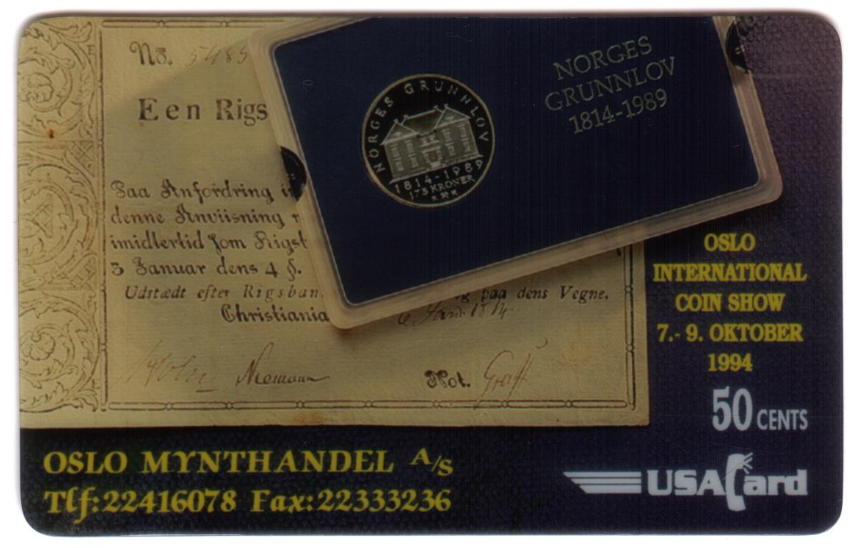 This collectible chip card is issued by the USACard Corporation and is associated with the Oslo International Coin Show, held in October 1994. It prominently features the event name "50 Cents Oslo International Coin Show (Banknote & Coin) Comp. 10/94" printed on the card, indicating its connection to numismatics and coin collecting. The card’s design includes stylized gold coins and currency imagery, emphasizing themes of money and collections.