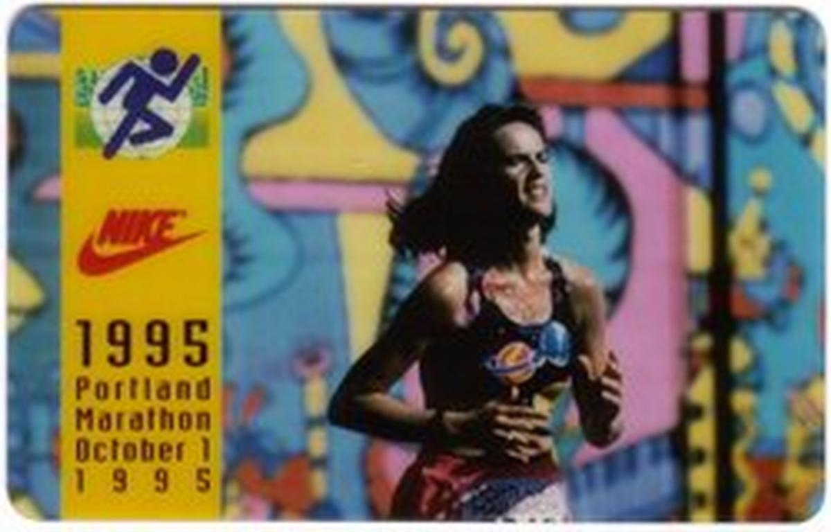Vivid Portland Marathon 1995 phone card featuring a female runner, sponsor logos, dynamic background, Nike swoosh, and event details, capturing 90s running culture. |