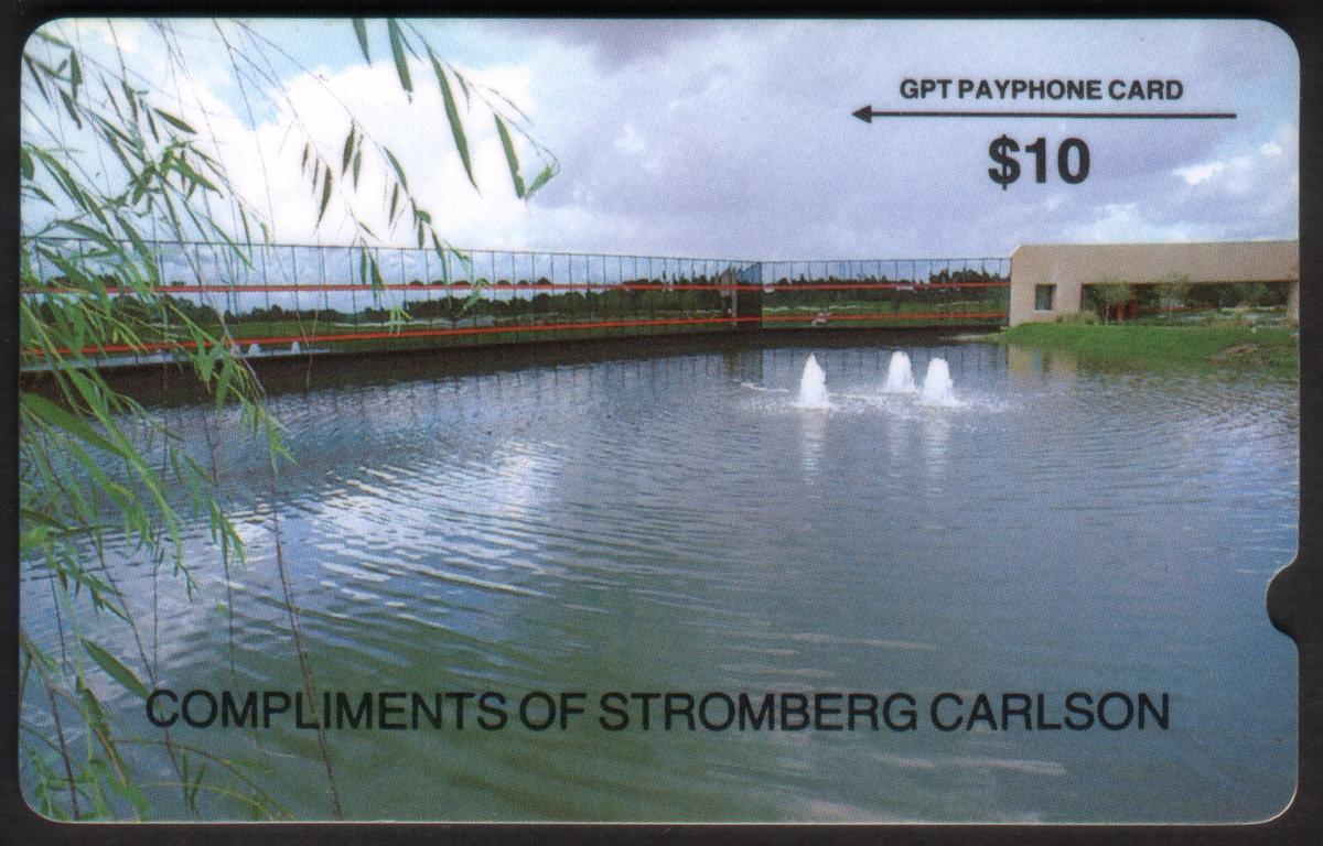 This collectible phone card features a detailed photographic image of a Stromberg Carlson GPT PayPhone situated near a scenic lagoon. The foreground displays lush green plants and tall grasses along the water’s edge. A gently flowing river or lagoon curves through the scene, reflecting the natural surroundings under soft lighting. The peaceful waterway and greenery emphasize a calm, nature-rich setting.