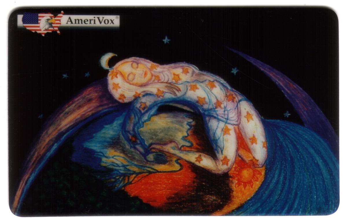 This collectible card from AmeriVox features an artistic and spiritual painting titled "Star Goddess Nuith Arching Over Earth" by Annette Kraemer. The artwork depicts a serene female figure, the Lady of the Stars, gracefully arching over a stylized representation of the Earth. The figure’s body is adorned with orange stars, and a golden sun symbol is visible near her hip. She wears a crescent moon on her head, enhancing the celestial theme.