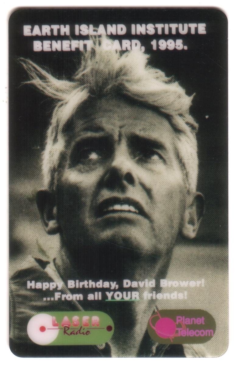 No numerical values or denomination appear on the visible front side. The layout is clean, with a focused message on ecological friends and conservation linked directly to Earth Island Institute and its 1995 promotional birthday event honoring David Brower. The style and text arrangement make this a distinctive collectible card celebrating green activism.