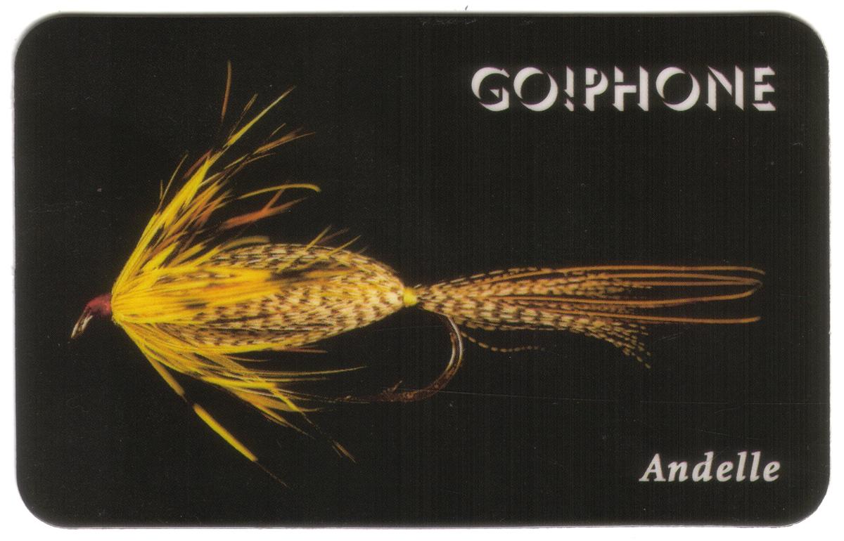 Additional text features the terms “go-phone,” “go phone,” and “gophone,” which relate to the card’s telecommunications use. The overall design combines clear lettering with striking visual elements to appeal to collectors interested in fishing, fly tying, and related outdoor sporting hobbies.