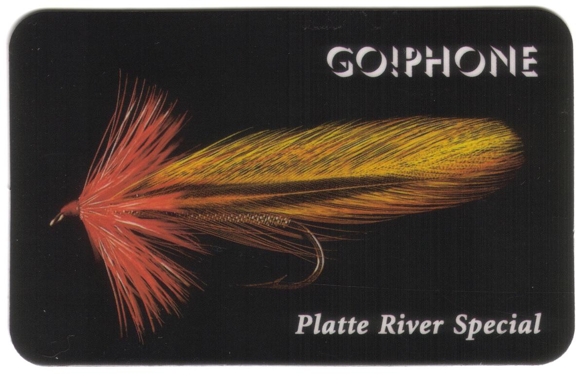 This collectible phone card features artwork related to fly fishing. The main image presents a detailed close-up of a fishing fly known as the "Platte River Special," skillfully tied by Marvin Nolte. The fly is displayed against a black or very dark background, highlighting its intricate details. This fishing fly is composed of feathers and materials in shades of brown, tan, cream, and white, arranged to imitate the appearance of an aquatic insect used to attract trout.