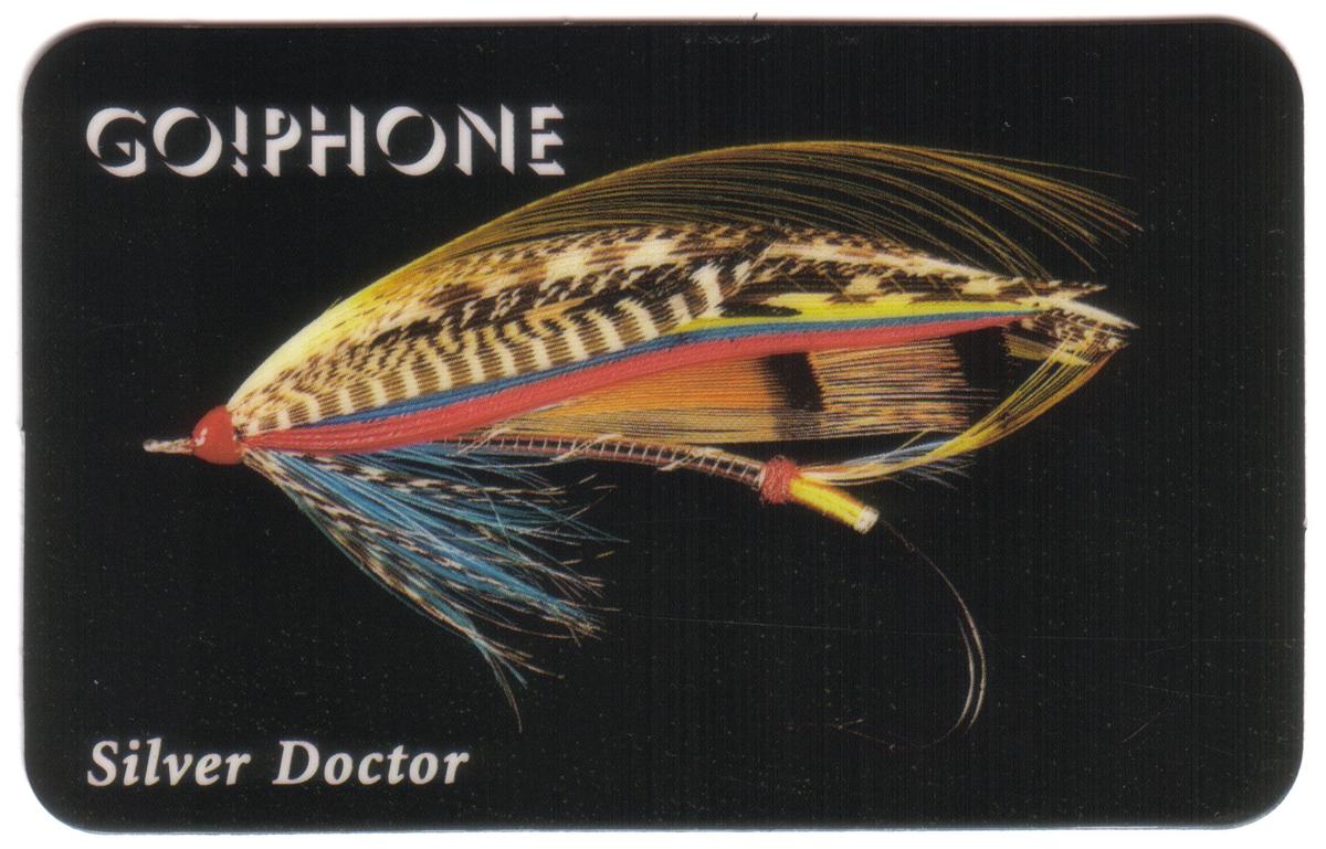This collectible phone card features a detailed image related to fly fishing and fishing flies. The central focus is on a fishing fly lure known as the Silver Doctor, which is tied by Marvin Nolte. The Silver Doctor fishing fly is showcased with a close-up view that highlights its intricate design, including metallic and feather components designed to attract trout. This carefully crafted lure is presented in a way that emphasizes its use in trout fishing.
