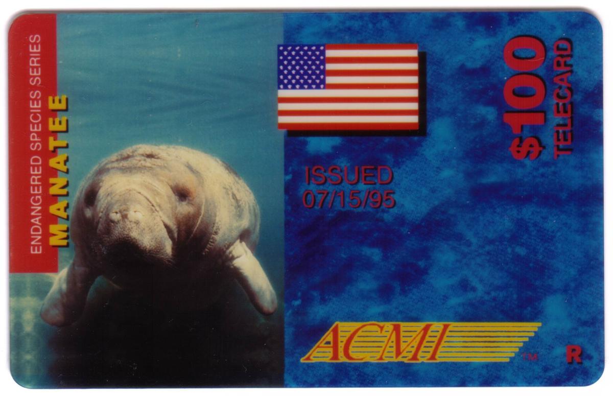 This telecard combines themes of endangered wildlife and American pride through its imagery of the sea cow and the American flag, making it a collectible item issued in 1995 that highlights conservation awareness within the United States.